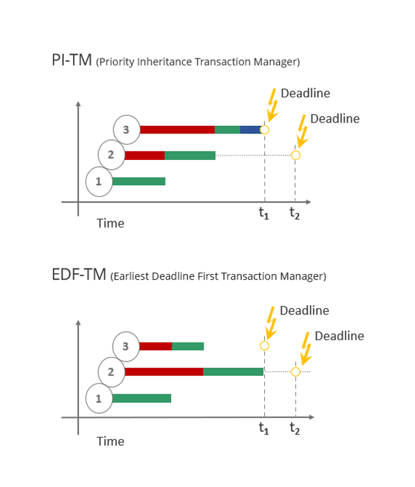 - Adaptable real-time transaction managers: Real-time transaction scheduling goals differ from one application to the next. One application could seek to schedule transactions to minimize the number of “aborted” transactions and may or may not allow pre-emption by a “higher priority” transaction; another application could aim to maximize the total “weight” (deadline + priority) of successful transactions while another application might simply prioritize transactions with the earliest deadline.