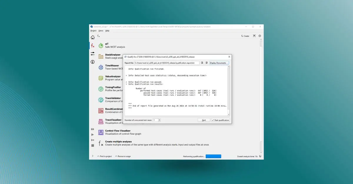 AbsInt aiT qualification run results showing validated timing analysis and test case execution statistics