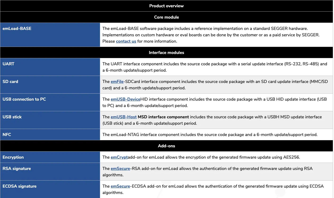 emLoad is available as the core module emLoad-BASE. It requires a mandatory interface module, for which SEGGER offers different shipments including the respective source code and update interface for USB Host, USB Device, SD, UART, or NFC (NTAG). In addition, various add-ons are available to meet security requirements.