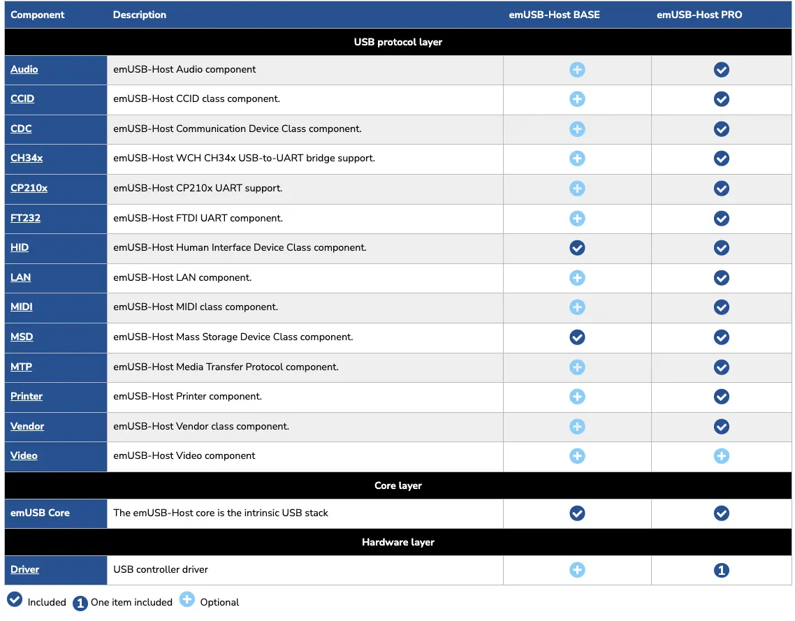 SEGGER recommends to purchase emUSB-Host as a complete package by selecting the emUSB-Host PRO package. It includes support for the most common use cases, such as handling human interface devices for user interaction, handling USB sticks to export and import data, printer support and serial communication support. The following table shows, which modules are part of the PRO package and which are optionally available.