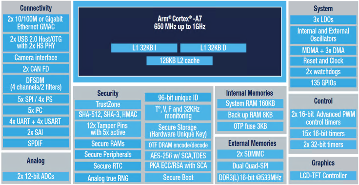 STM32MP135 microprocessors (MPUs) are based on a single Arm® Cortex®-A7 core running up to 1GHz. They feature a dedicated LCD-TFT parallel display interface, a 16-bit parallel camera and dual Ethernet ports.